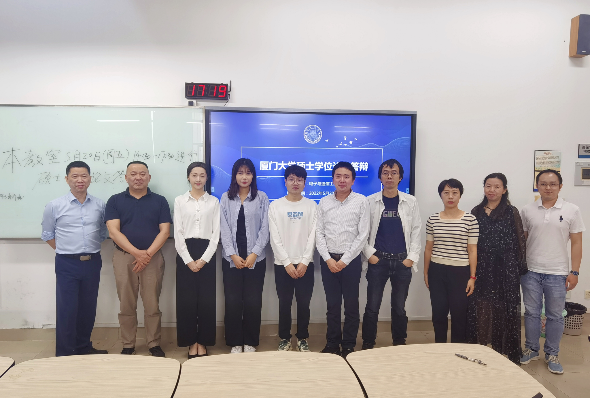 2022年5月20日下午,课题组2022届吴昕玥和胡振兴两位同学的硕士论文答辩在厦门大学海韵教学楼举行。本次答辩邀请了厦门大学电子科学系屈小波教授、蔡聪波教授以及厦门大学附属中山医院影像科林建忠主任医师作为答辩评委,并通过腾讯会议的形式线上同步开放,在线参会人数多达20余人。